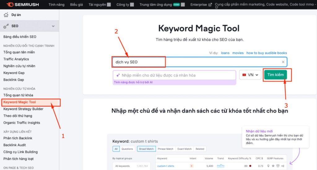 Để thực hiện nghiên cứu từ khóa với SEMrush, bạn cần làm theo 2 bước sau: